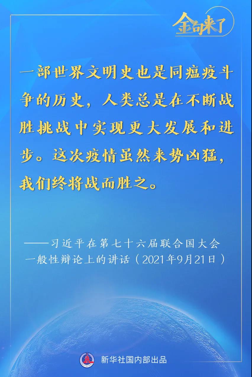 第一,我們必須戰(zhàn)勝疫情,贏得這場事關(guān)人類前途命運(yùn)的重大斗爭。人類總是在不斷戰(zhàn)勝挑戰(zhàn)中實(shí)現(xiàn)更大發(fā)展和進(jìn)步。我們要堅(jiān)持人民至上、生命至上,弘揚(yáng)科學(xué)精神、秉持科學(xué)態(tài)度、遵循科學(xué)規(guī)律,統(tǒng)籌疫情防控和經(jīng)濟(jì)社會發(fā)展,加強(qiáng)國際聯(lián)防聯(lián)控。要把疫苗作為全球公共產(chǎn)品,確保發(fā)展中國家的可及性和可負(fù)擔(dān)性,當(dāng)務(wù)之急是要在全球范圍內(nèi)公平合理分配疫苗。中國將努力全年對外提供20億劑疫苗,在向“新冠疫苗實(shí)施計(jì)劃”捐贈1億美元基礎(chǔ)上,年內(nèi)再向發(fā)展中國家無償捐贈1億劑疫苗。中國將繼續(xù)支持和參與全球科學(xué)溯源,堅(jiān)決反對任何形式的政治操弄。