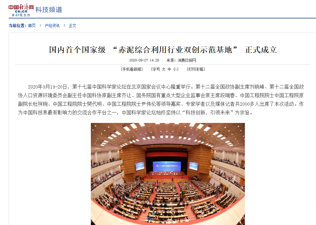 中國經(jīng)濟網(wǎng) 刊載 國內(nèi)首個國家級 “赤泥綜合利用行業(yè)雙創(chuàng)示范基地” 正式成立
